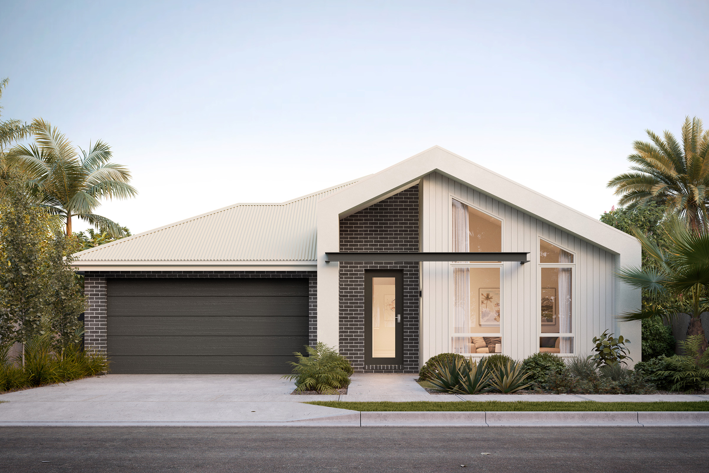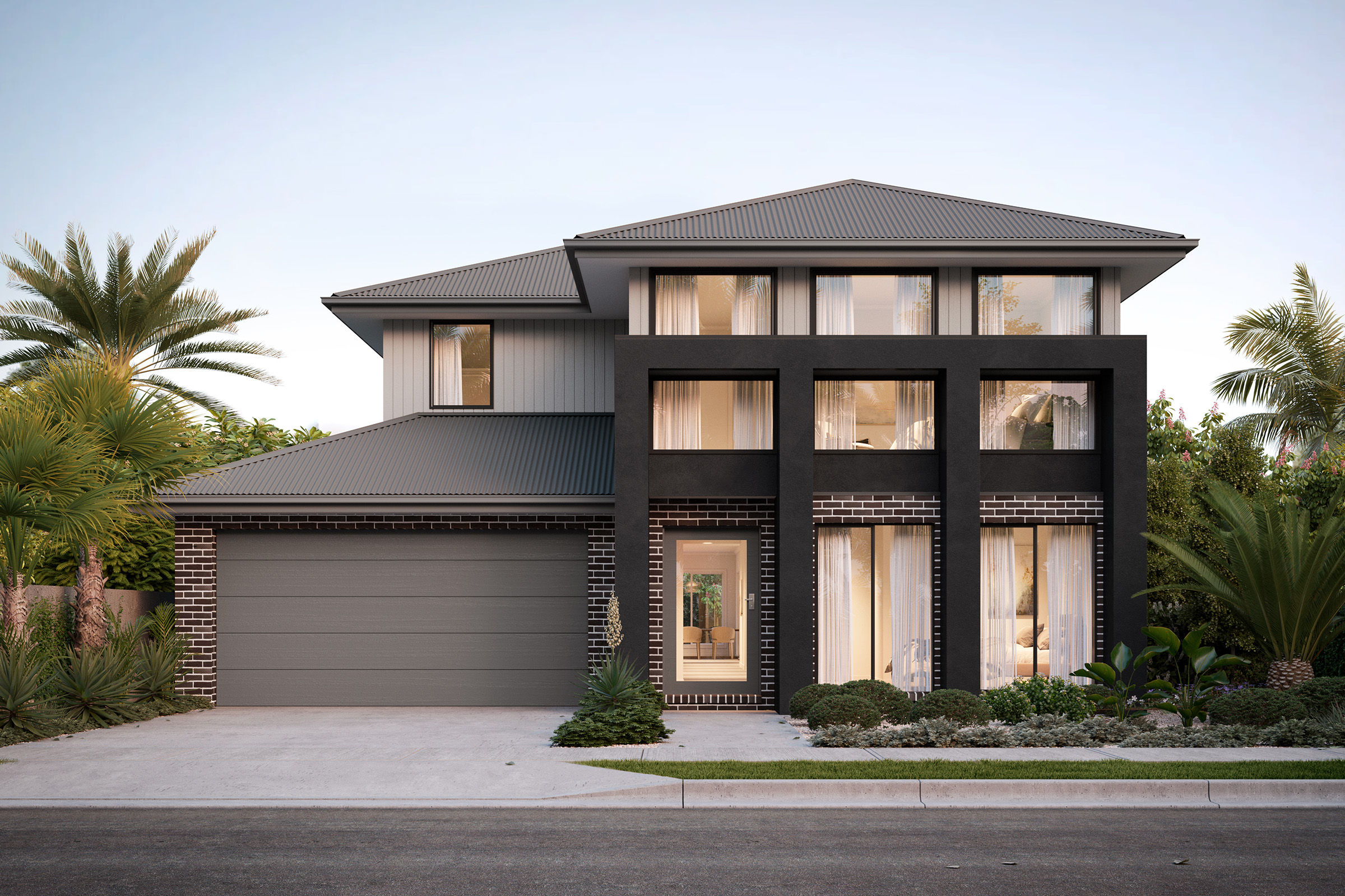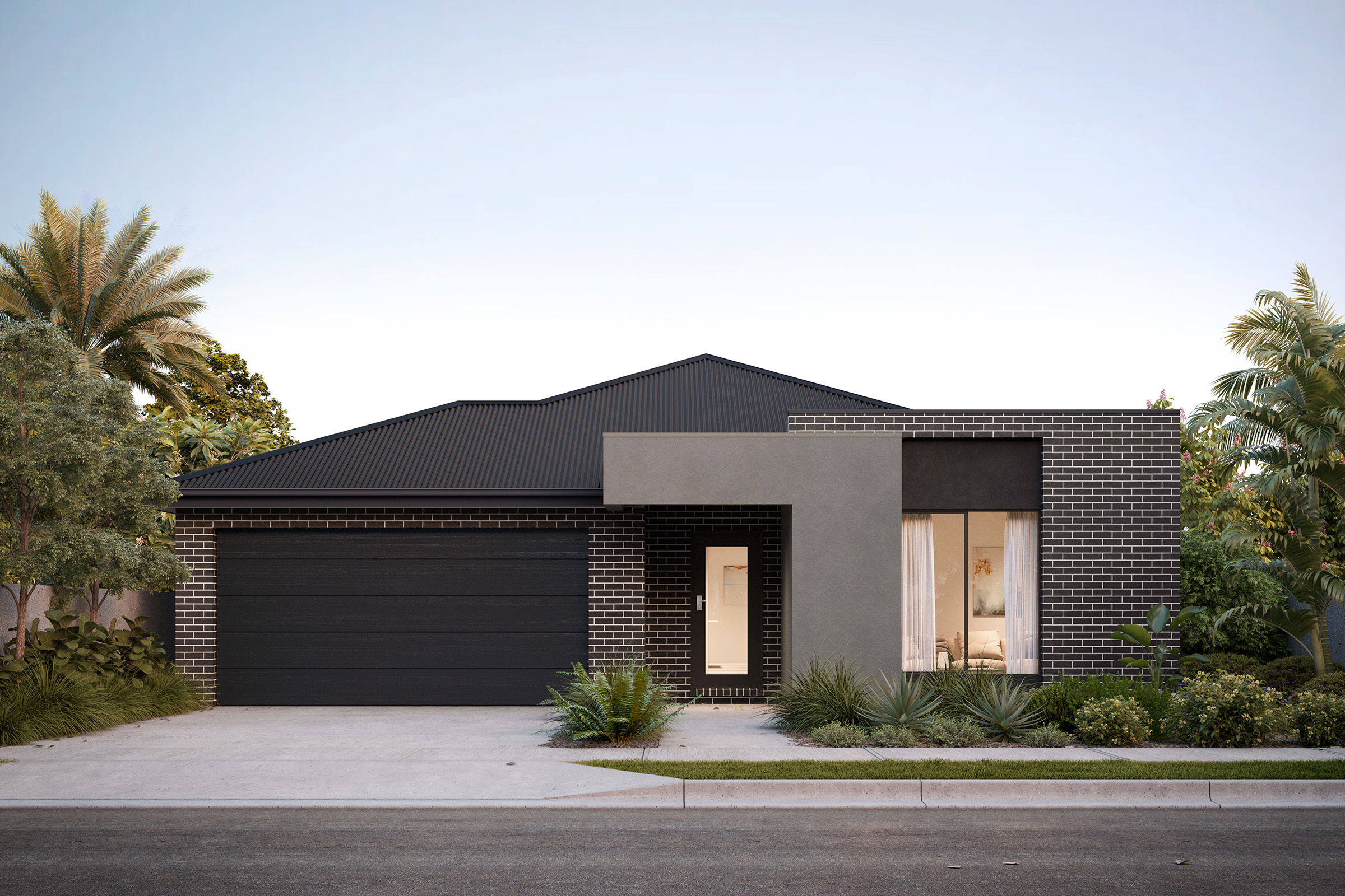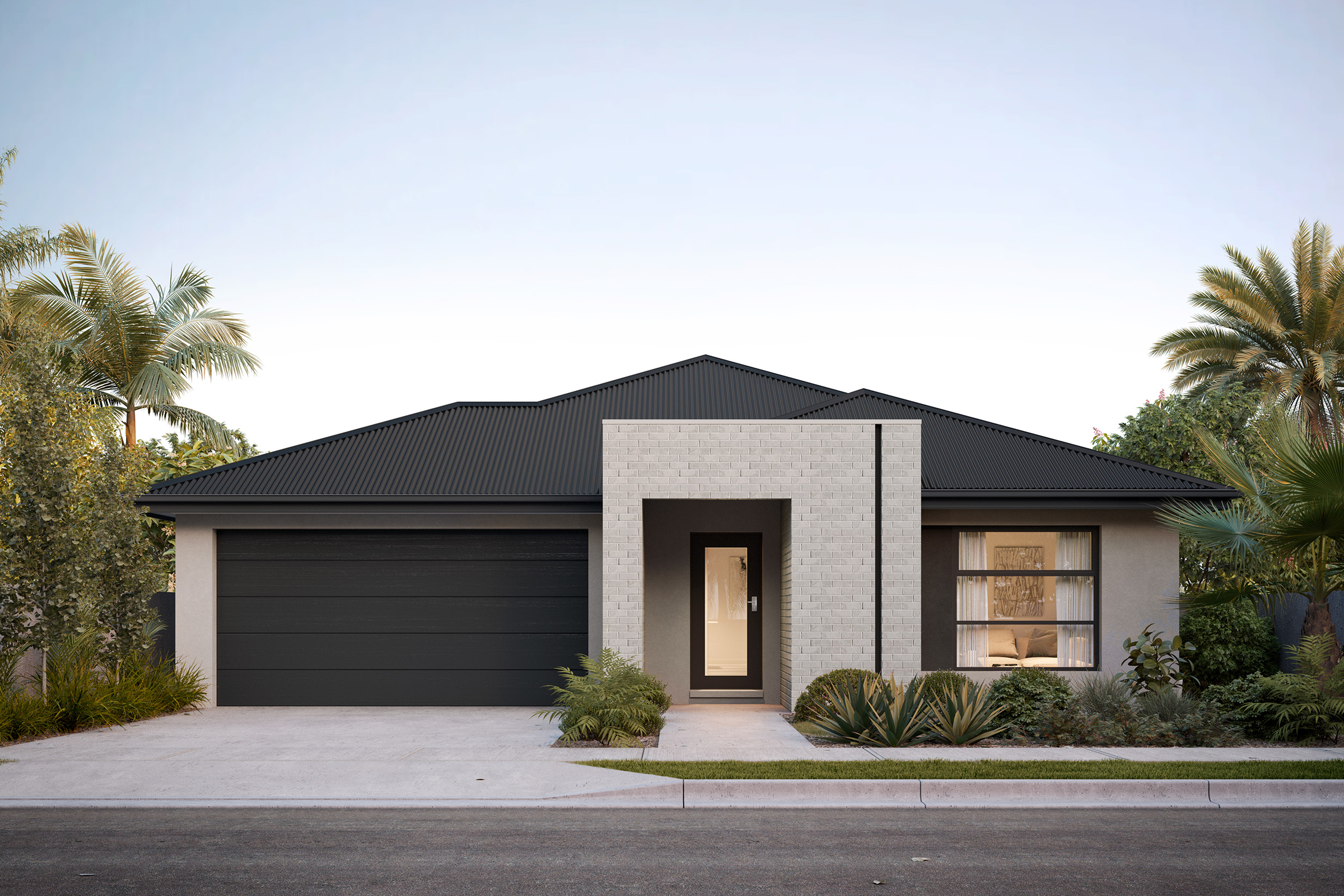 This sophisticated palette creates a harmonious and modern look that stands the test of time. The classic combination of black and grey contrasts against the white bricks to add depth and balance. To complement this exterior, incorporate materials like stone and metals in your landscaping.