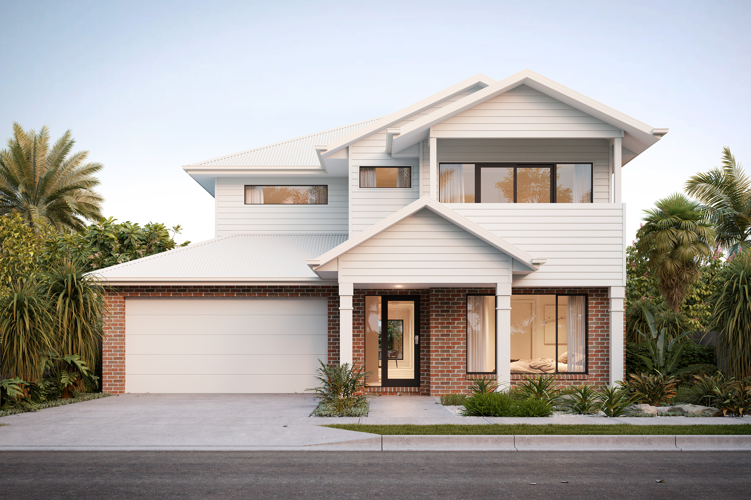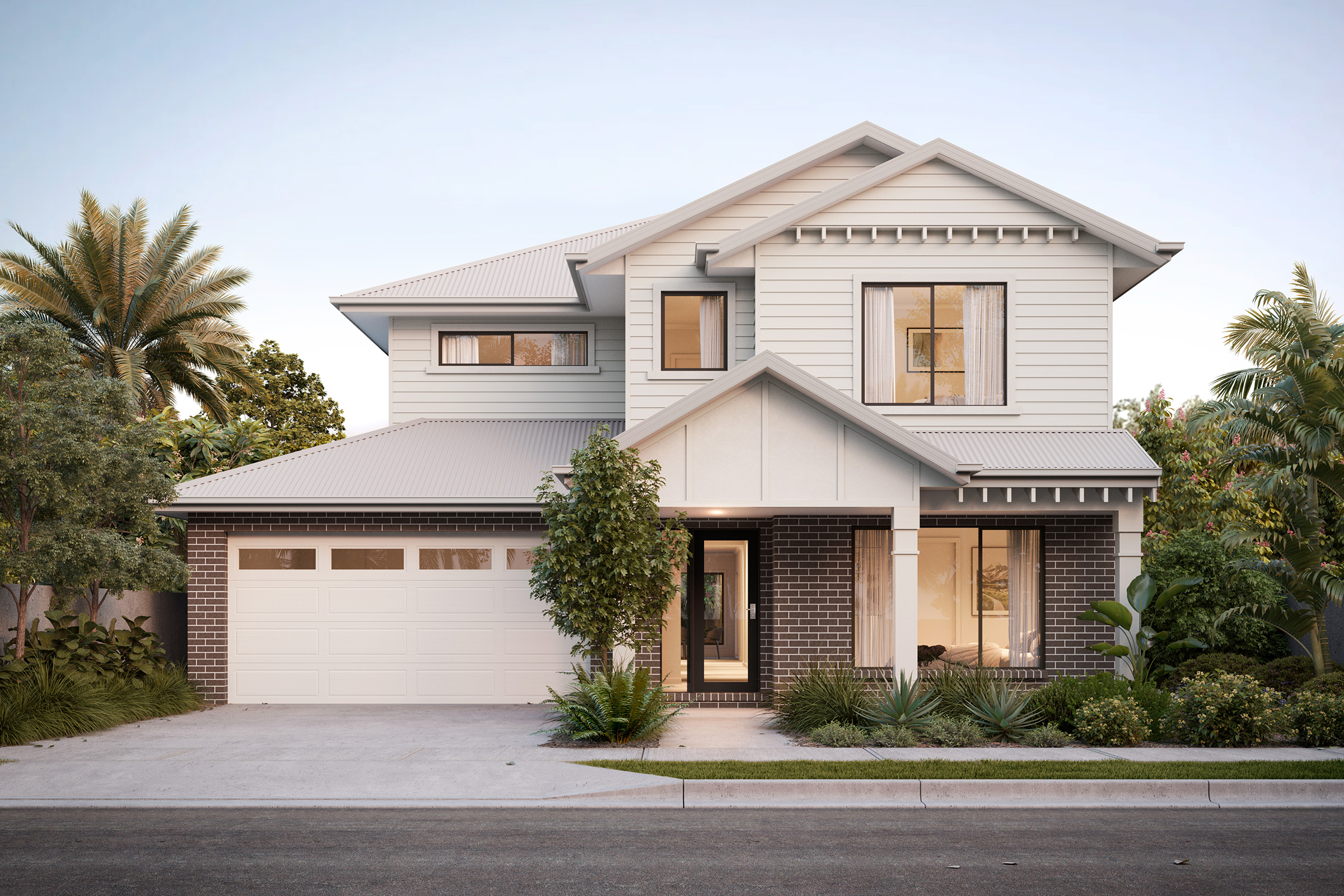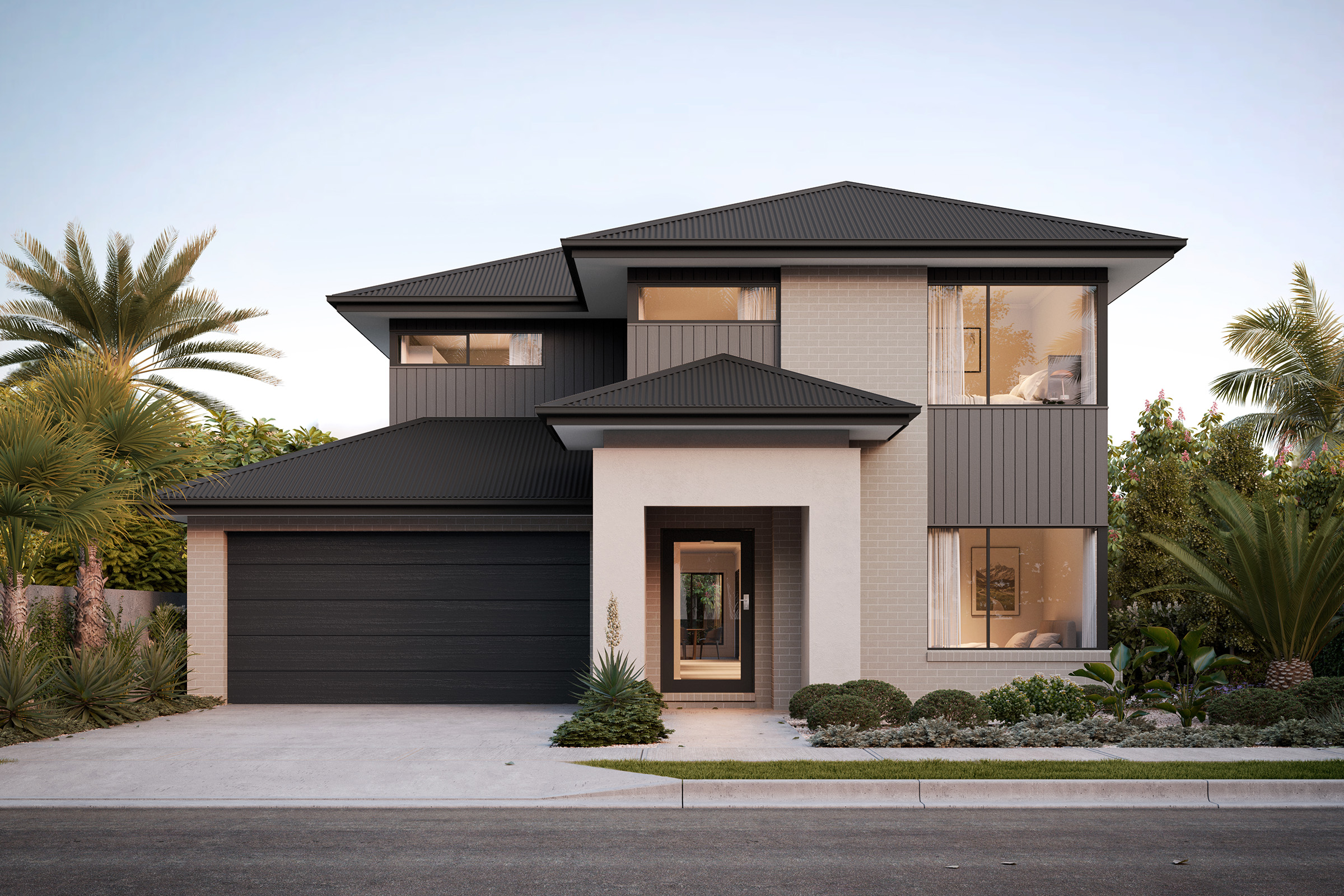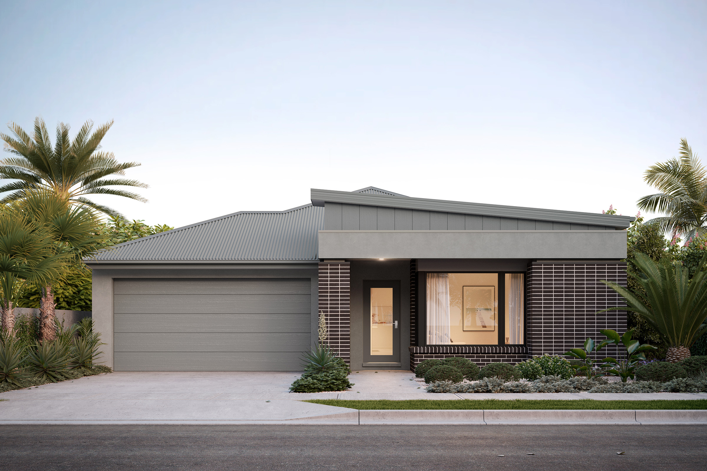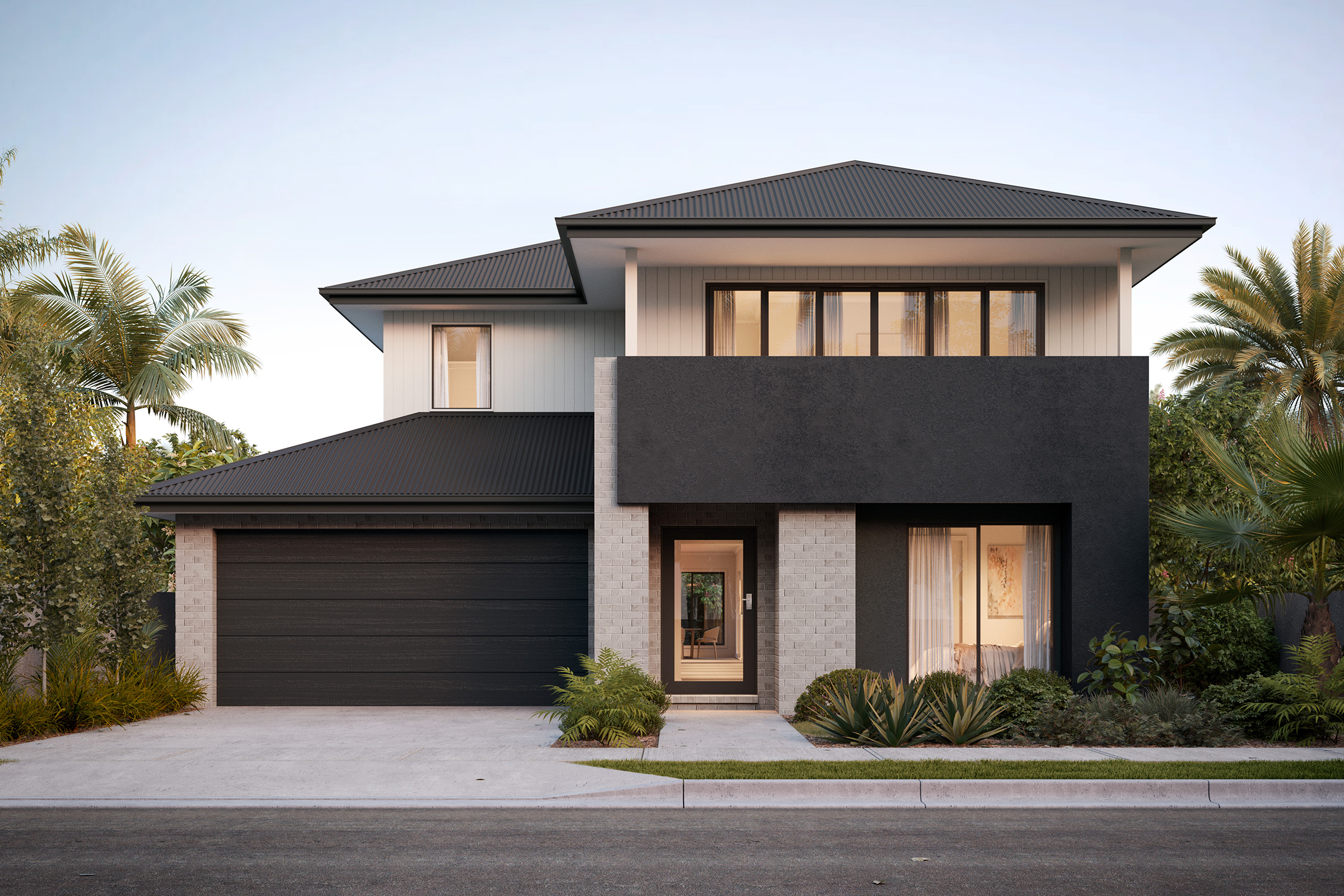 This sophisticated palette creates a harmonious and modern look that stands the test of time. The classic combination of black and grey contrasts against the white bricks to add depth and balance. To complement this exterior, incorporate materials like stone and metals in your landscaping.