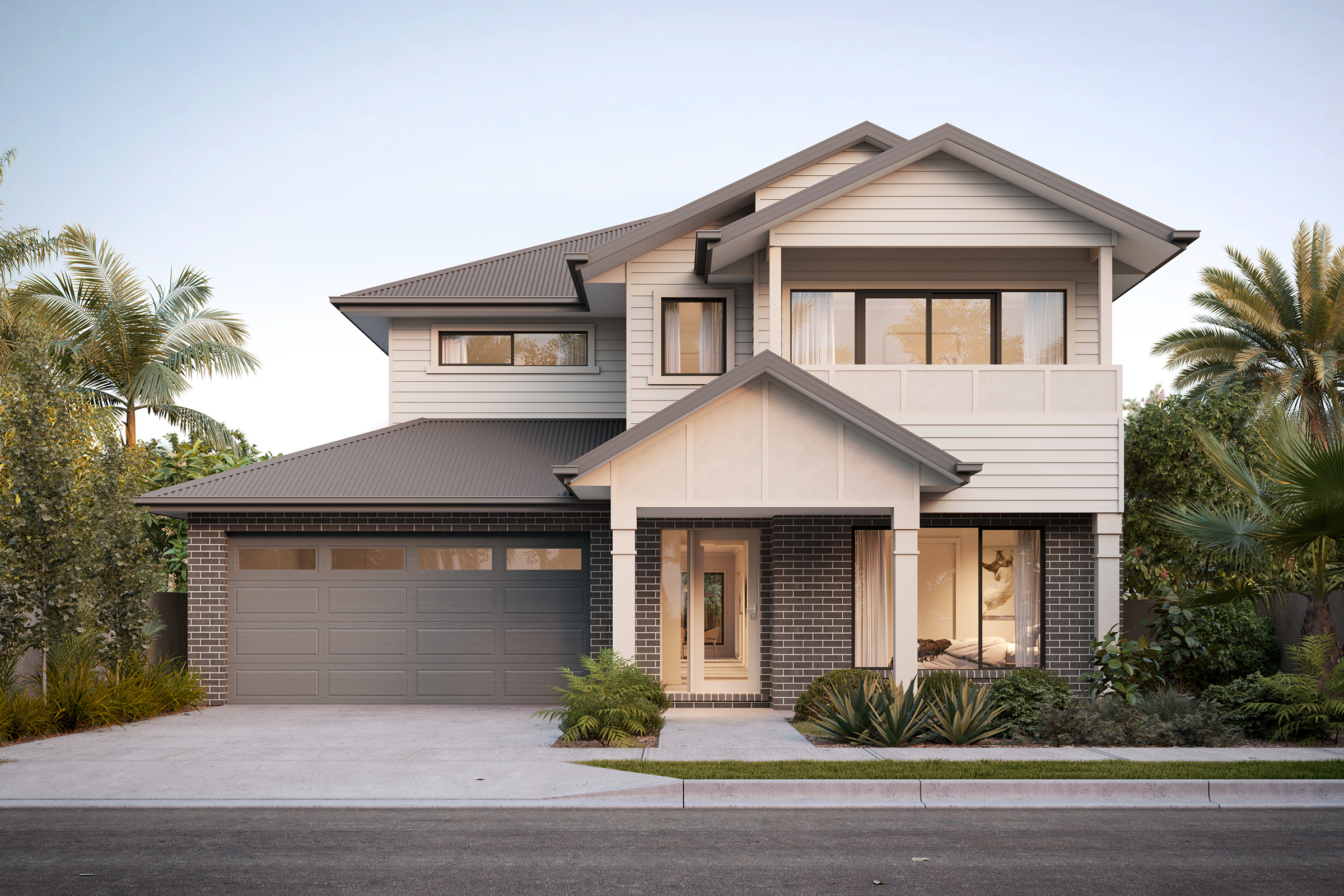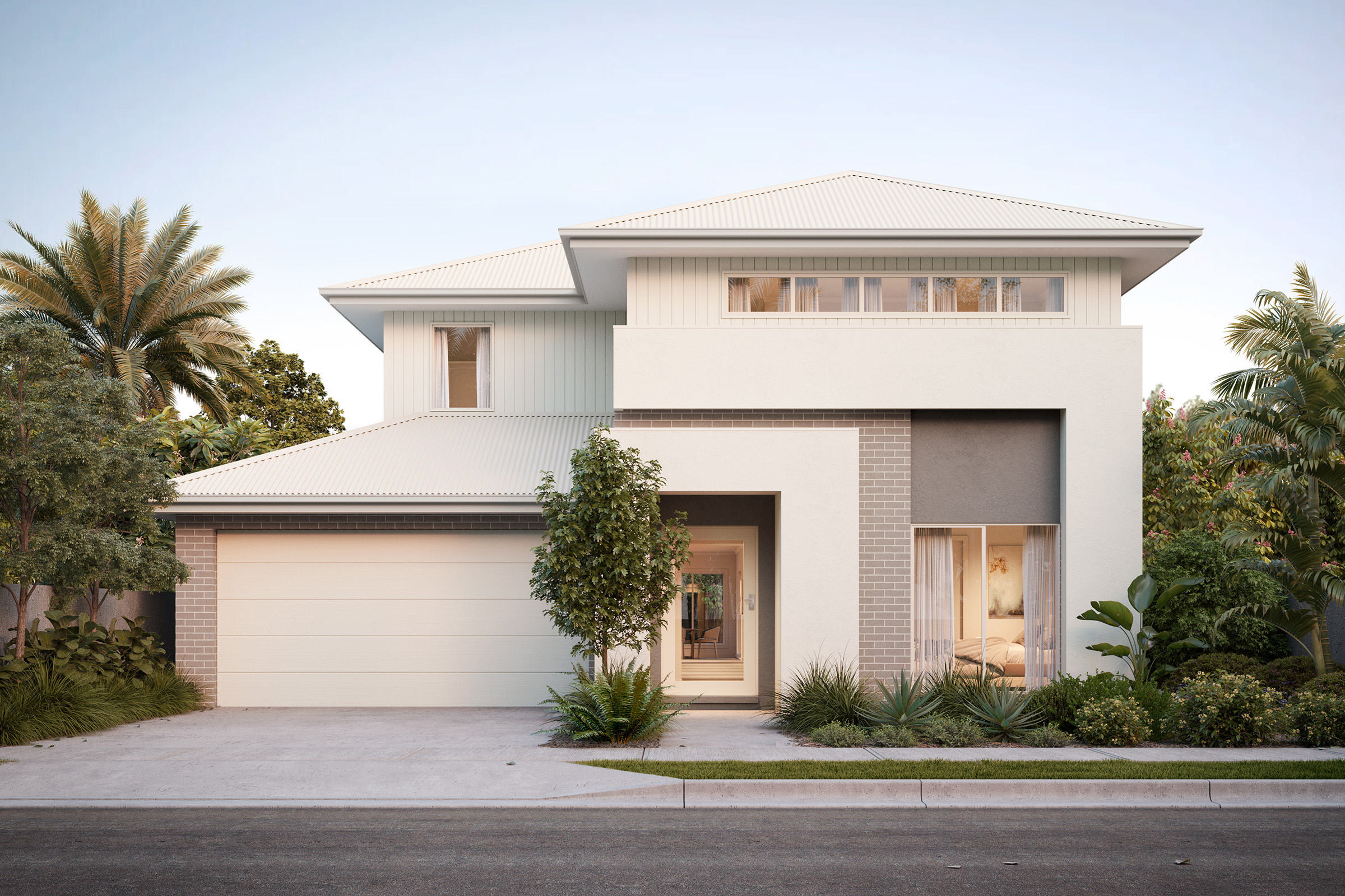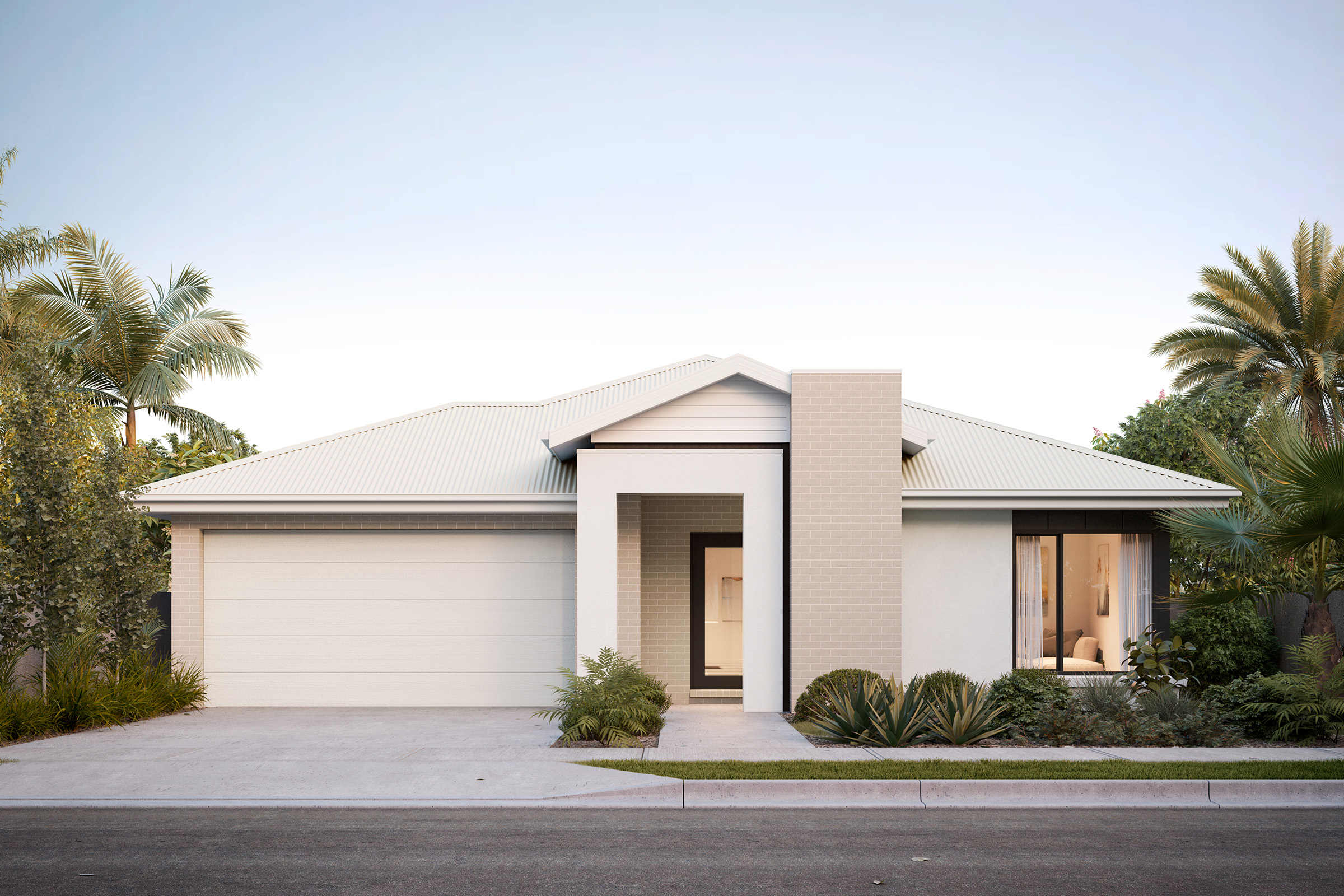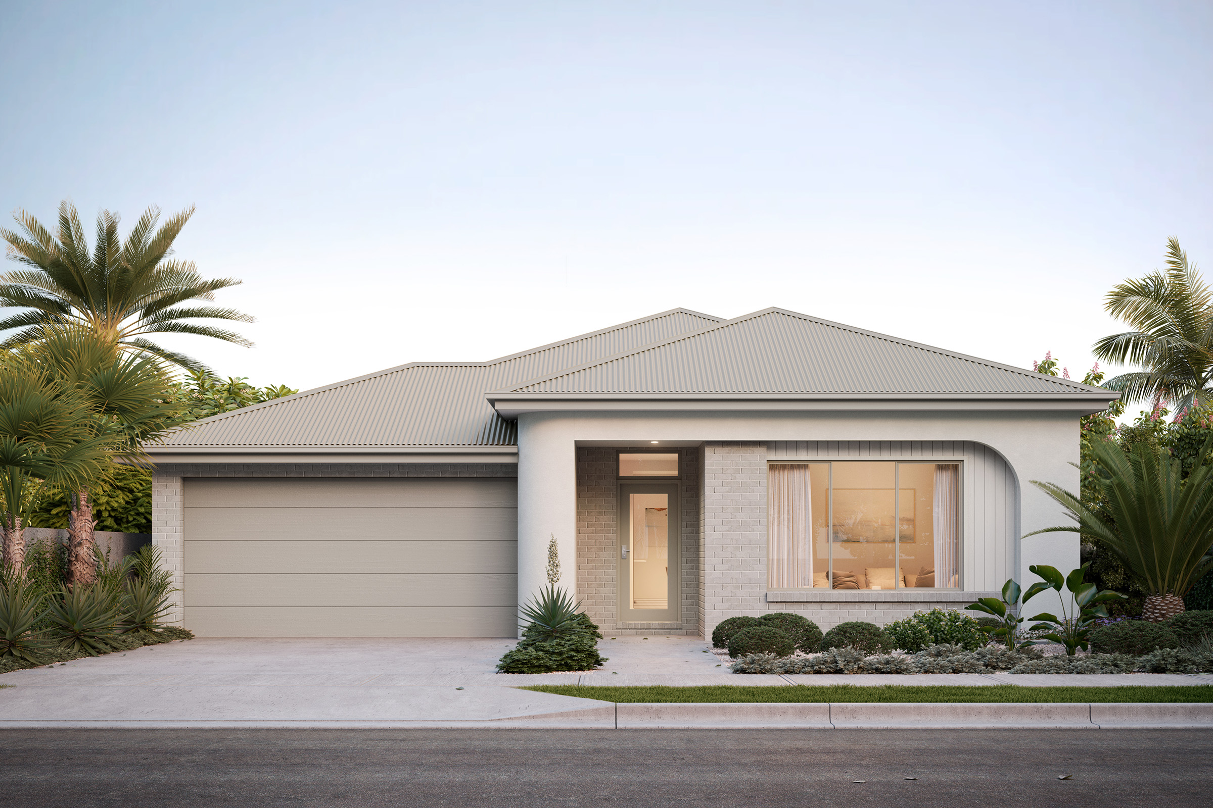 Capturing the charm of natural hues and warm undertones reminiscent of sandstone, this palette creates a welcoming and earthy aesthetic. Cream shades for the render, warm white bricks and soft grey roof tiles create a serene and inviting exterior.